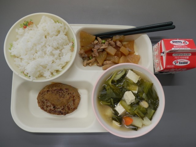 今日の献立は、ハンバーグおろしソースかけ、鶏肉と大根の煮物、小松菜の味噌汁、ご飯、牛乳です。