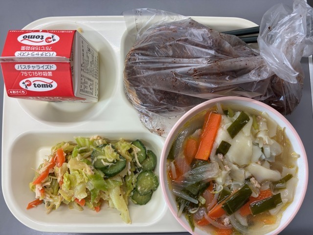 みんな大好き、ココア揚げパン! 公開日 2026/02/06 更新日 2026/02/06 お知らせ 今日の献立は、ココア揚げパン、ワンタンスープ、チキンサラダ、牛乳です。ココア揚げパンはもっちりしていて、食べ応えがありました。今週も今日で終了です。一週間頑張りました!