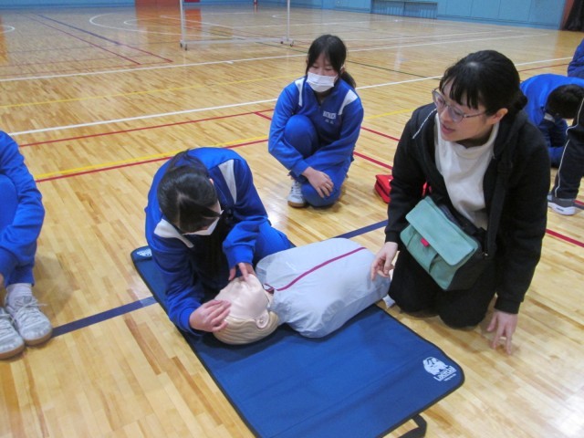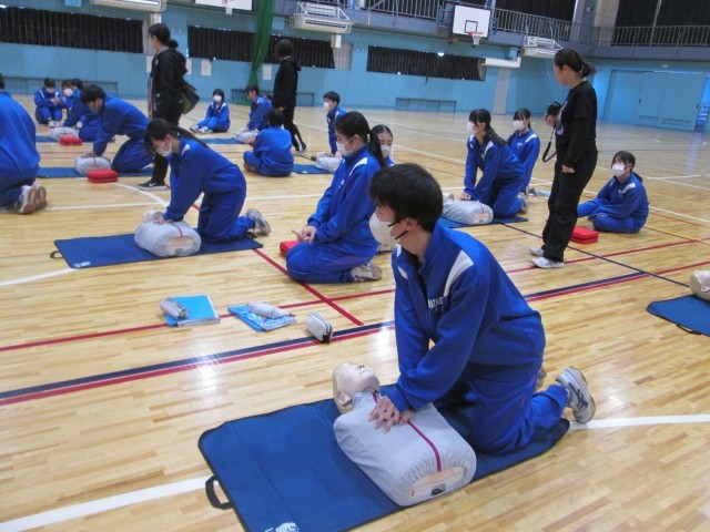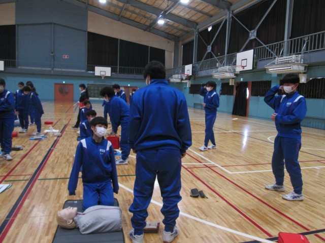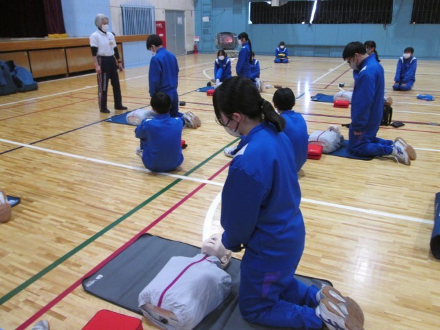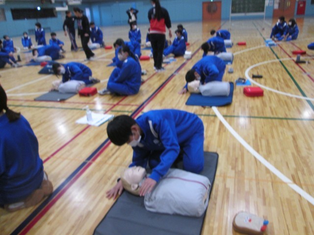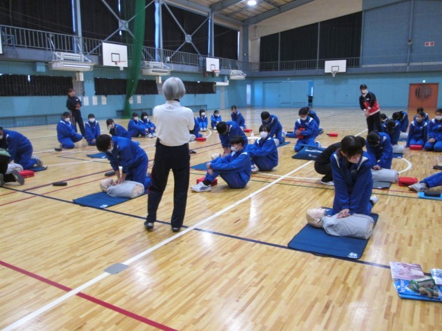 救急法講習会 公開日 2026/02/10 更新日 2026/02/10 お知らせ 2年生は、体育の授業で救急法講習会を行いました。日本赤十字社の方に来ていただき、救急法を学びました。心臓マッサージや人工呼吸などを体験的に学ぶことができました。「中学生が、部活指導中に倒れた先生を心臓マッサージで救った」という事例もあります。いざというとき、今日の講習が役立つことでしょう。 +6