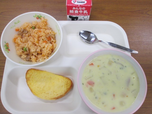 今日の給食はチキンライス 公開日 2026/02/24 更新日 2026/02/24 お知らせ 今日の献立は、チキンライス・コーンポタージュ・オムレツ・牛乳でした。チキンライスは、酸味がまろやかなトマトケチャップ味でした。コーンポタージュは、具だくさんで食べ応えがありました。今日は太陽が出ていなかったので、また寒くなりましたね。気温の変化が大きいので、体調を崩さないようにしましょう。