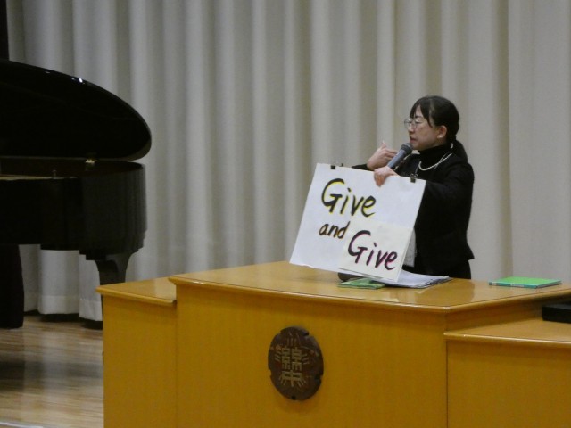 修了式では、「Give and Take」ではなく、「Give and Give」の心構えでいこう、という話をしました。