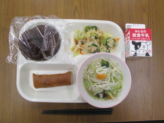 ※今日の給食 煮込みちゃんぽん、はるまき、チキンサラダ、ココアパン、牛乳