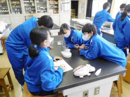 薬品を混ぜて化学反応させ、変化に驚いていました。