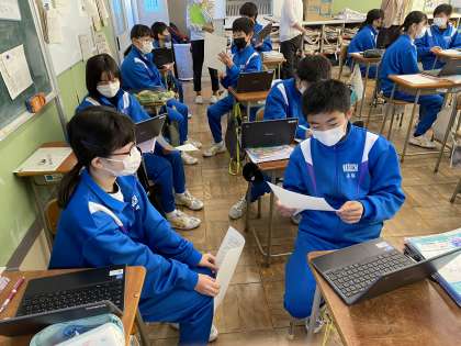 昨日、研究授業を行いました。There is(are)〜を使って、クロームブックの画像を見ながら、世界遺産を紹介し合っています。