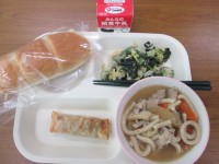 今日の献立は、えびとマカロニのクリーム煮・プチプチサラダ・ツイストロール・牛乳でした。