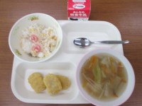 木曜日の献立は、チャーハン・エビ団子のスープ・チキンナゲット・牛乳でした。給食の...