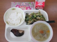 明日は小学校の卒業式です。今日は、デザート付きのお祝い給食でした。豚汁は、野菜と...