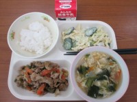 今日の献立は、みそだれ焼き肉・マカロニサラダ・かき玉汁・ご飯・牛乳でした。どのメ...