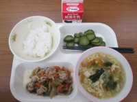 今日の献立は、みそだれ焼き肉・キュウリの中華漬け・かき玉汁・ご飯・牛乳でした。焼...