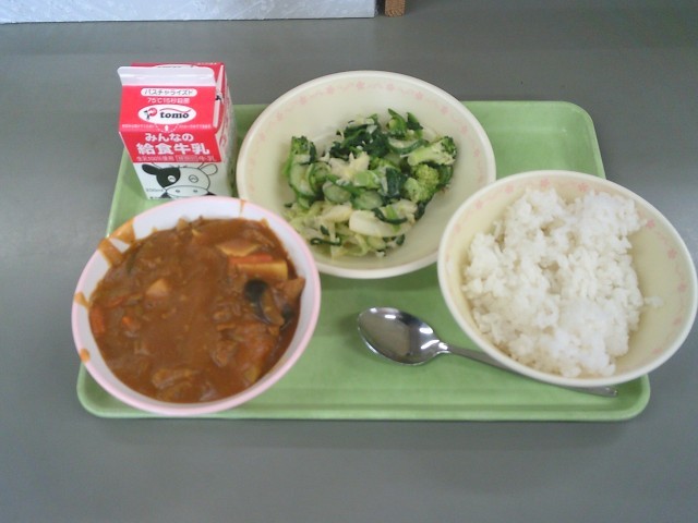 今日の給食は、藪小と藪南小の5年生が心を込めてつくってくれた「ごはん」、地元藪塚産の「なす」「ごぼう」「ほうれん草」「さつまいも」等が入った「藪塚秋野菜カレー」「藪塚野菜サラダ」でした。