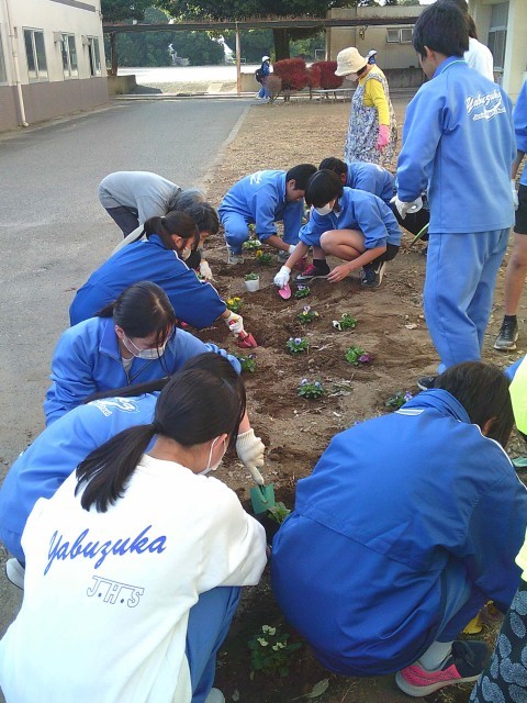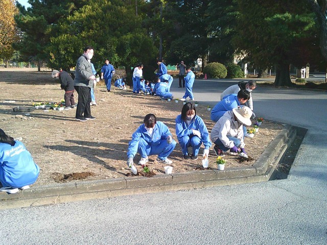 花いっぱい運動が行われました 公開日 2025/11/21 更新日 2025/11/21 お知らせ 群馬県つくしの会・更生保護女性会藪塚支部・藪塚本町婦人会から11名のボランティアの方々に来ていただき、パンジーの植えつけが行われました。絵に描いたような秋晴れの下で、色合いや配置・植えつけ方などのアドバイスをいただきながら、生徒会本部・園芸委員の生徒48名が植えつけを行いました。
