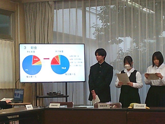 学校保健委員会 公開日 2025/12/11 更新日 2025/12/11 お知らせ 今回は、保健委員会の発表『アウトメディアにチャレンジして生活習慣を見直そう』が、中心的な内容でした。「24時間をどう使うかによって生活が大きく違ってくる」ことを、大人にも教えてくれました。今後は、全校生徒が発表を視聴し、一人一人の生活習慣を改善していくように、仕向けていってほしいと思います。