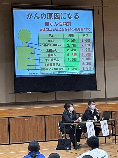 喫煙や薬物乱用によって、体にどんな影響が出るのか・周囲にどのような迷惑がかかるのか等について、数値やグラフ・動画を用いてたいへん具体的に説明していただくことができました。