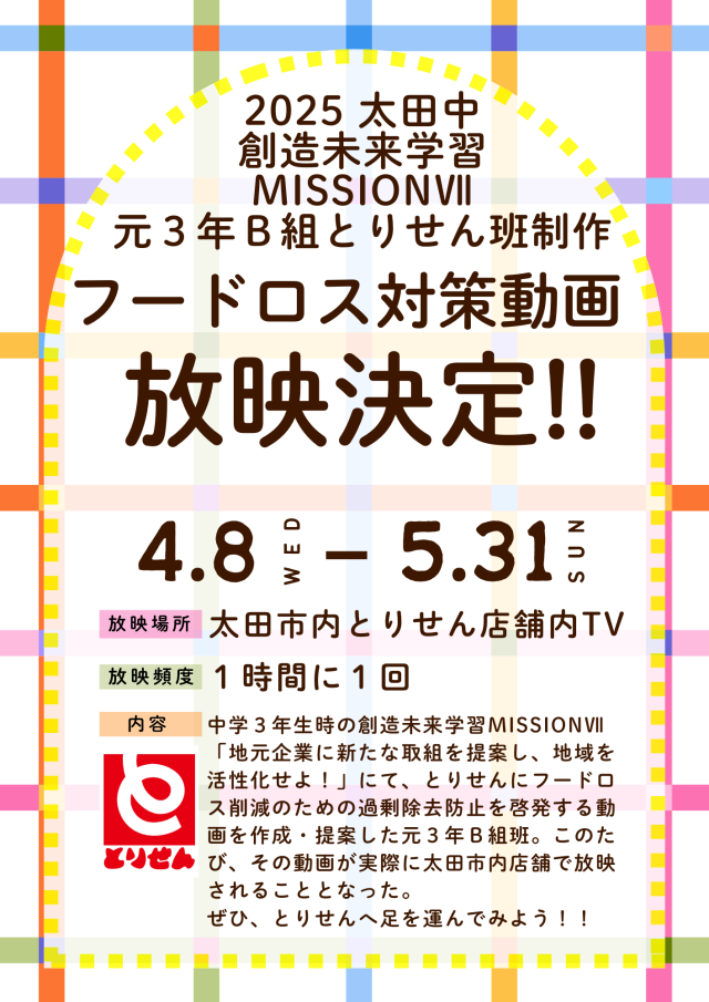 『とりせん』店内で放映! 創造未来学習 公開日 2026/04/13 更新日 2026/04/13 その他 昨年の3年生が作成した「フードロス対策動画」が太田市内のとりせん店補内TVにて、放映されることになりました!この動画は、創造未来学習(総合的な学習)での取組の一環で作成したものです。1時間に1回の頻度で放映されるそうなので、とりせんに行ったらチェックしてみてください。 いいね(3)