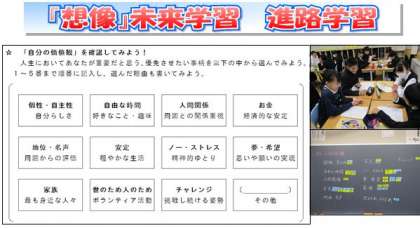 進路学習が始まりました。夢や目標がある人もない人も、自分の将来についてじっくりと考える時間を持つことは大切です。ただ、なかなかイメージすることが難しい部分もあるため、段階的に授業を進めていきたいと考えています。今回は、『自分の価値観を知る』という部分にフォーカスしてグループでの交流まで行いました。価値観は人それぞれ異なると同時に、自分の中でも変化していくものでもあります。授業で考えたこと、話し合ったことなどを家族で話題にしてみてもおもしろいかもしれませんね。